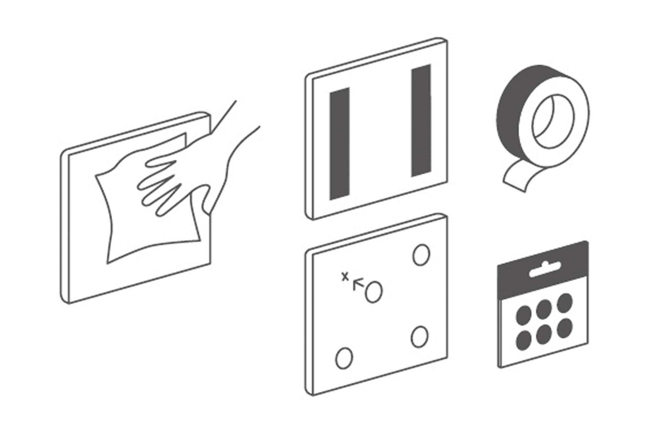 Reinige die Rückseite des Paneels. Sie muss sauber, trocken und staubfrei sein. Du kannst Klettpunkte oder Klettstreifen verwenden. Flausch- und Klettseite zusammenfügen und auf der Rückseite des Paneels positionieren.