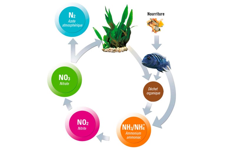 Dans l'aquarium, les différentes étapes du cycle de l'azote se déroulent en principe comme dans la nature. Cependant, la quantité de déchets azotés produits est supérieure à celle qui peut être consommée et décomposée par les plantes, par exemple les excréments de poissons, les restes de nourriture ou les plantes mortes. À des concentrations élevées, ces composés azotés ont un effet plus ou moins nocif sur les organismes présents dans l'aquarium.