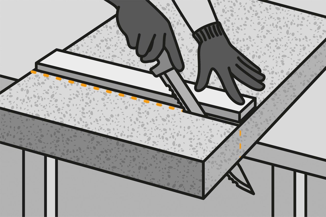 Découpe maintenant le premier panneau isolant. Tu peux commencer la deuxième rangée avec le morceau restant. N'oublie pas que tu auras également besoin de morceaux plus petits pour les coins et les espaces intermédiaires.