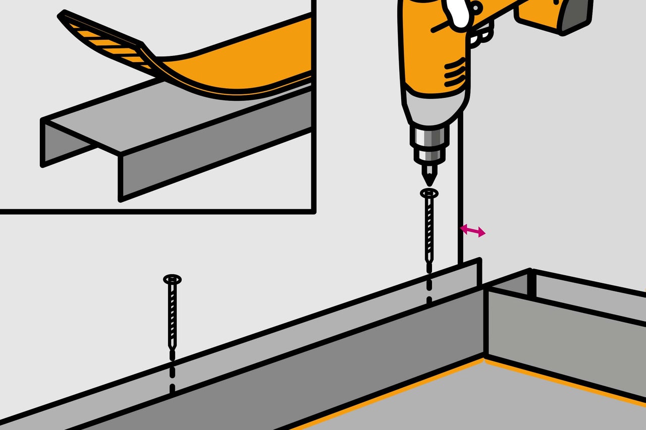 Colle maintenant la bande d'étanchéité sur les profilés et fixe-les au plafond et au sol à l'aide de chevilles. Insère maintenant les profilés de support dans les profilés de cadre.