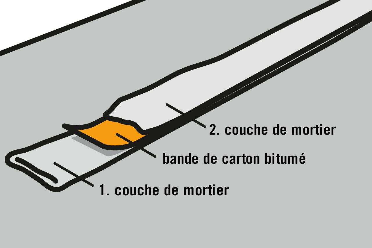 Afin qu’aucune source d'humidité ne puisse monter dans la maçonnerie, tu dois poser une couche barrière faite d'une couche de mortier au ciment, d'une bande d'étanchéité pour maçonnerie et d'une autre couche de mortier au ciment sous la première rangée de pierres.