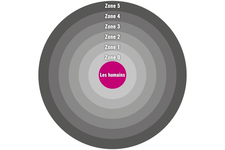 Dans l'idéal, un jardin en permaculture se compose de cinq zones dont l'homme est le centre. En principe, plus la zone est proche de l'homme, plus elle est densément plantée en règle générale. Plus une zone est éloignée de l'homme au centre, moins elle doit nécessiter d'entretien.