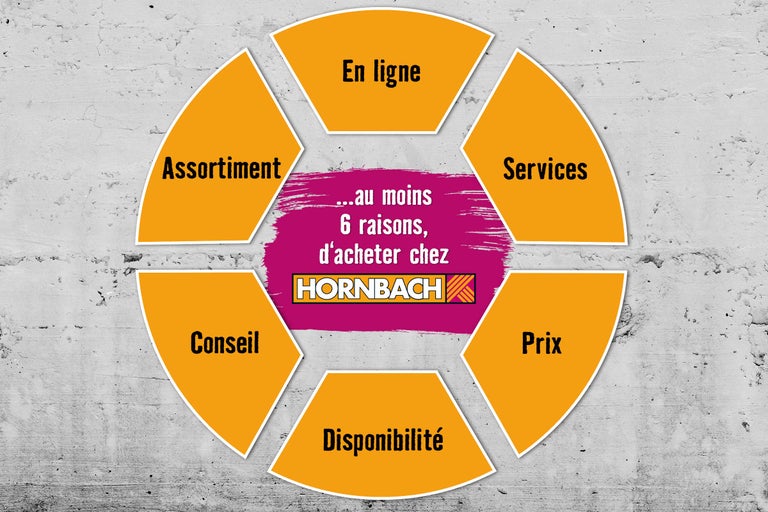 HORNBACH Suisse livre le matériel à toutes les personnes quie n'hésitent pas à mettre la main à la pâte. Notre passion s'adresse à tous ceux qui créent à la force des mains quelque chose de nouveau ou rénovent quelque chose d'ancien, qui n'ont pas peur de se salir les mains ou d'avoir des épaules douloureuses, qui n'hésitent pas à transpirer et qui vissent, scient, martèlent, peignent, plantent, etc. jusqu'à ce qu'ils soient satisfaits du résultat.