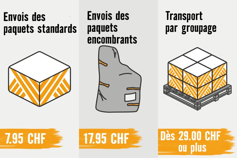 - Envois des paquets standards = tous les articles dont les frais d'expédition s'élèvent à CHF 7.95 sur la page des détails de l'article.